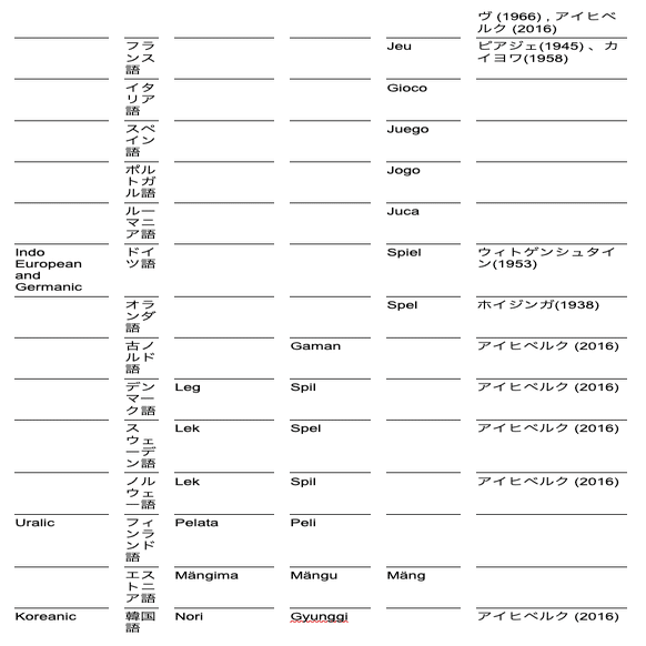 英語における「ゲーム」の意味も、決して安定しているというわけではないが、現代英語における「game」「play」および「game」と「play」を包括した概念の範囲をより、包括的な言語間のばらつきについてFelix Labed[3]がまとめたものがある。(表を参照)