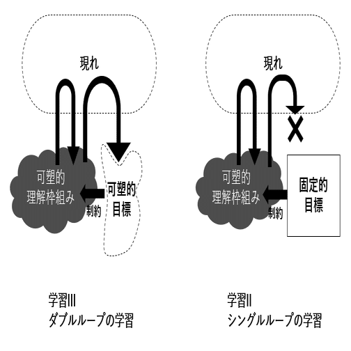 一方で、「目標」については、目標自体が固定される場合と、固定されない場合とで分けてしまうことができる。目標の方向性が固定されていれば、シングル・ループの学習となり、飽きることや学び方の目標を変更することのできるものであればダブル・ループの学習に繋がりうるものだ。