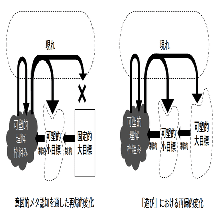 すなわち学習の仕方が固定されている場合というのは、「認識は可塑的に変化しているが、目標は固定的」で、学習の方策自体が再帰的に変化するものは「認識が可塑的であると同時に、目標も可塑的である」という形をとる(下記の図を参照)。